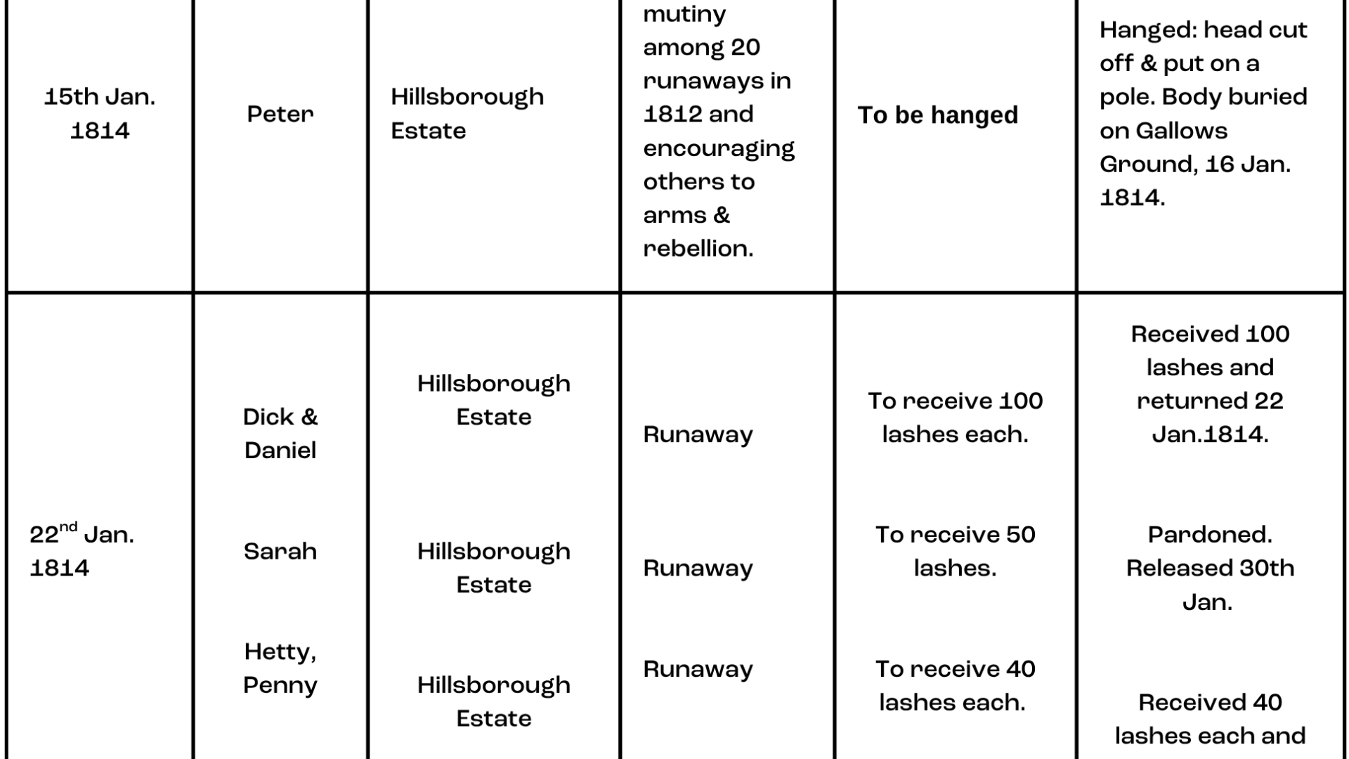 Peter was ordered to lead Bremner to the freedom seekers, but instead took him on a futile mission, ‘scrambling for part of two days over hills and dales, crags and precipices’ with no intention of reaching the ‘desired spot’. Eventually, one of the freedom seekers returned and confessed upon interrogation that Peter had instigated the plot and had upheld communication to supply them with provisions in their absence[15]. Like many, Peter was subsequently executed, in the British campaign to suppress Maroon forces and their allies, as court records from Dominica show[16].